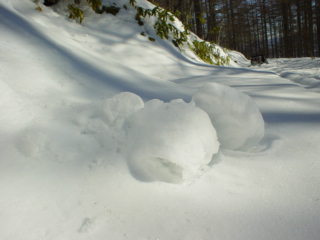 初級コースのあちこちで見かけた天然雪だるま、傾斜の距離によっては1m位に 成長するものがあるとか。